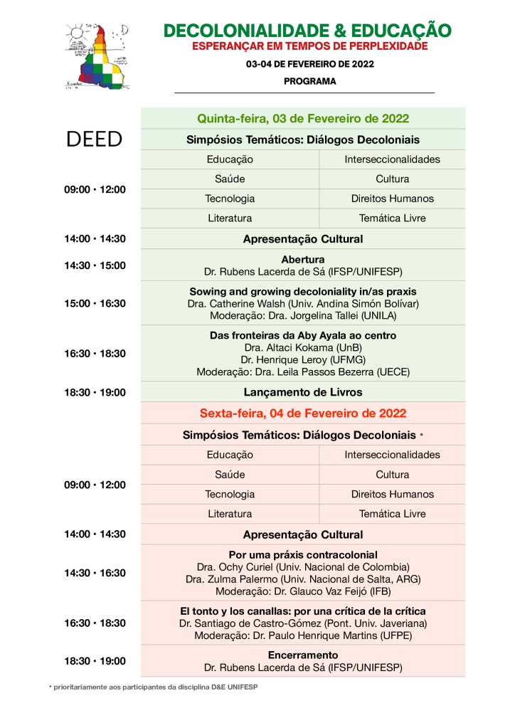 Hoje divulgamos o evento “Decolonialidade e Educação: esperançar em tempos de perplexidade”, organizado pelo Programa de Pós-Graduaçaõ em Educação e Saúde (PPGES) da Escola de Filosofia, Ciências Humanas e Letras (EFLCH) da Universidade Federal de São Paulo (UNIFESP). Ocorrendo nos dias 03 e 04 de fevereiro de 2022, via Zoom e gratuitamente, o evento conta com pesquisadores interessados em estudos pós-coloniais, decoloniais e de educação.