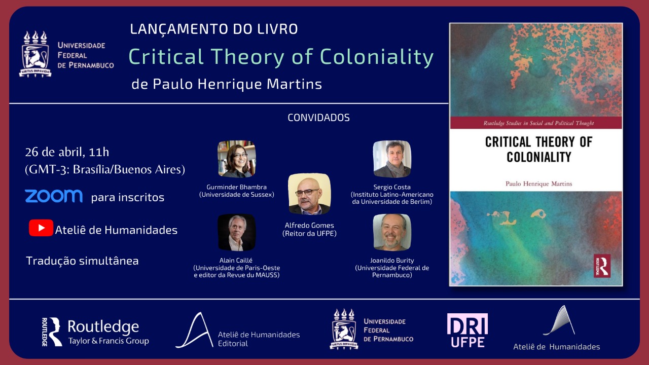 Junte-se a nós para o lançamento do livro Critical Theory of Coloniality, de Paulo Henrique Martins. A publicação é resultado de colaboração do selo editorial Ateliê de Humanidades com a editora Routledge, na sua série “Studies in Social and Political Thought.”